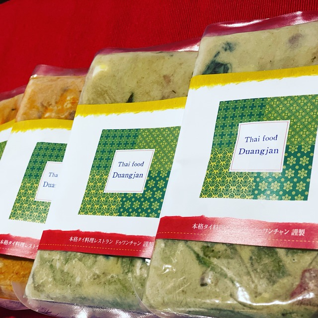 ドゥワンチャンの超人気のカレー詰め合わせにしたベストセラーのセット!タイカレーはグリーンカレーだけじゃなく糸島グルメグランプリで優勝した当店では辛さ控えめのレッドパネーンカレー! 王道のグリーンカレーは1度食べたらやめられない! タイ人シェフが心込めて作った料理是非ご自宅でも。 グリーンカレー×2.レッドカレー×2、タイ米×4 アレルゲン 調味料(アミノ酸など)海老、豚、鶏、ピーナッツ、魚醤(魚介類を含む)大豆、小麦、卵、乳製品